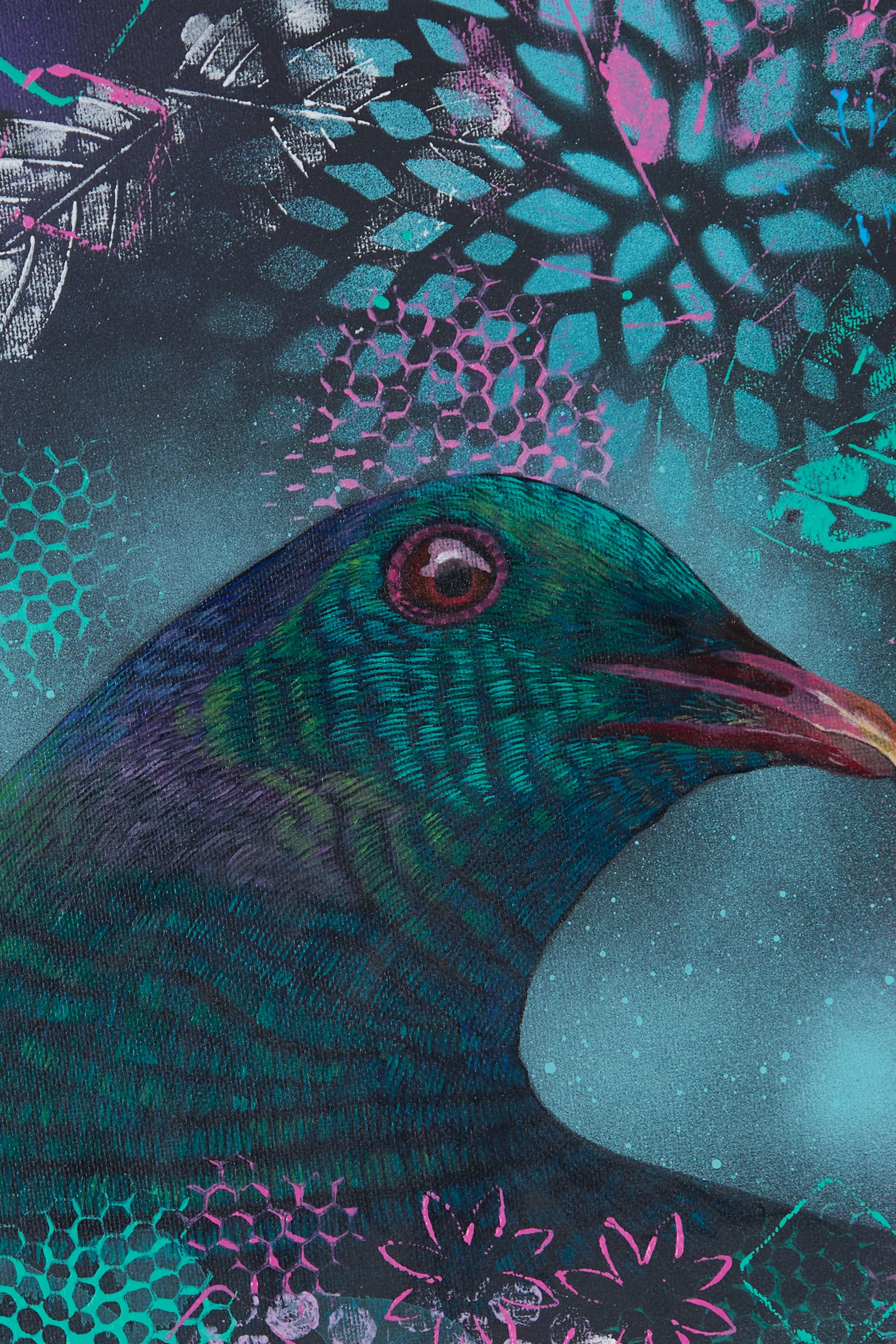 "By using everyday objects for mark making and exploring the freedom of various mediums, the artist creates ethereal, expressive backgrounds. These atmospheric layers are then paired with finely detailed depictions of native birds, resulting in striking, harmonious compositions that bring a unique presence to any space."